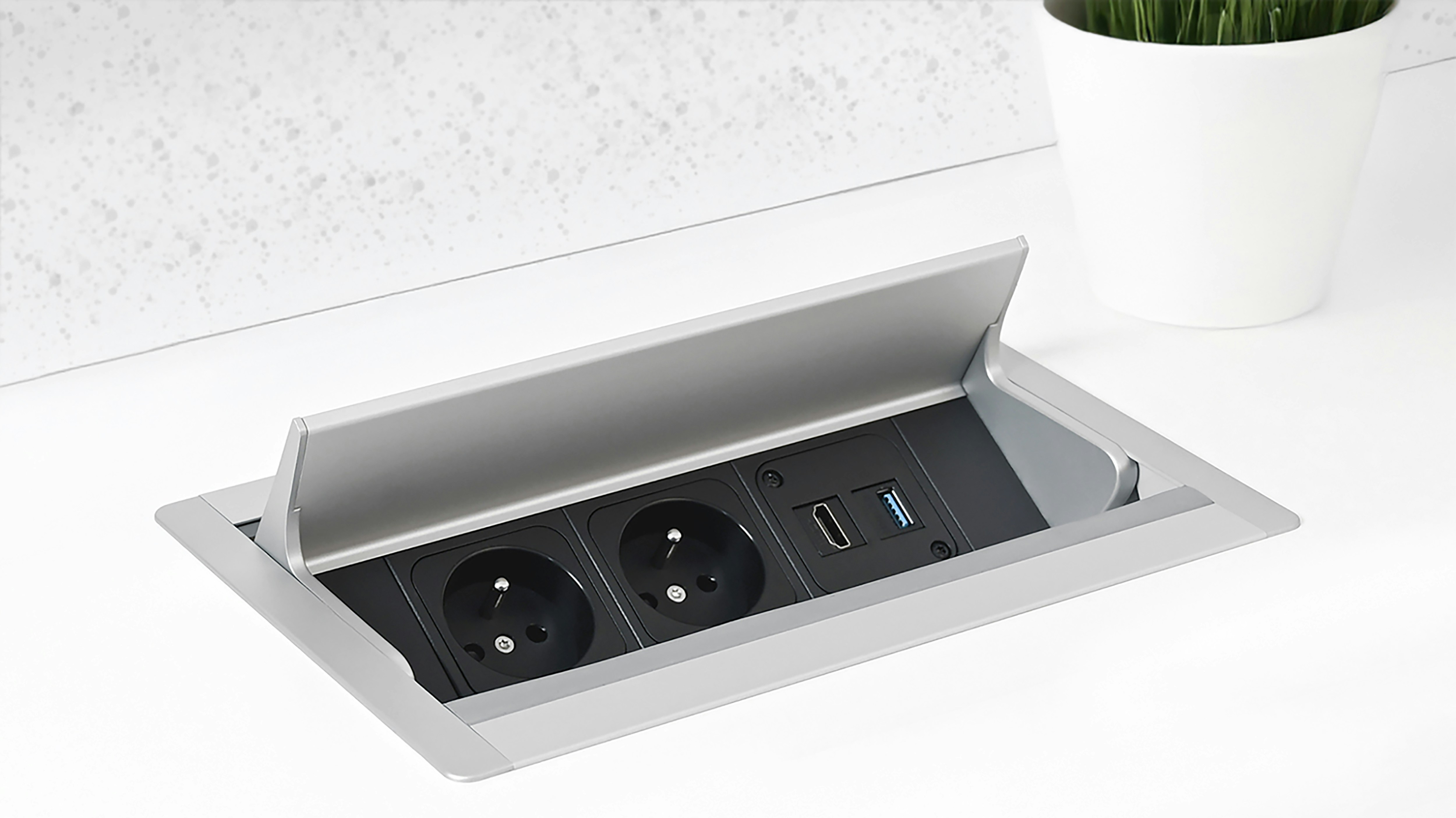 在廚房中島安裝了插座,雖然使用了較好看的面板,但還是覺得破壞了中島的一體性。不如將插座藏在桌子底下,既美觀又實用。
